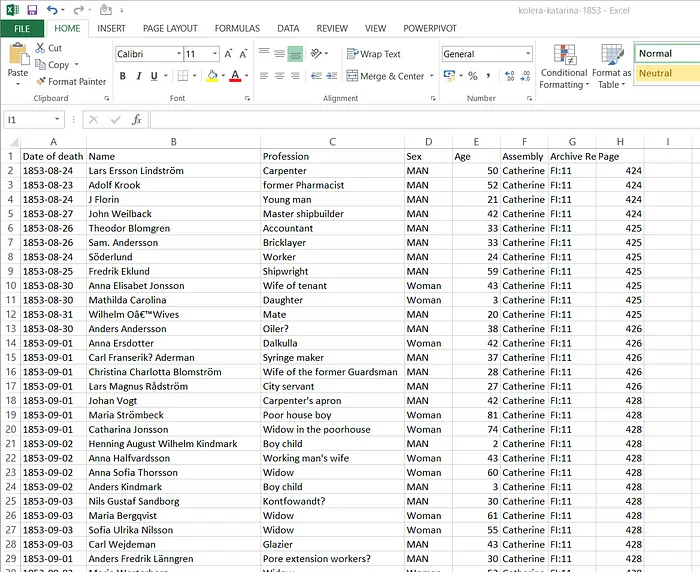 The Dataset used in this Analysis may be limited in several ways because it was collected in a church environment by writing. The data was put together in Saint Catherine Parish in Stockholm. The data contained a total of 8 columns and 248 rows with each row containing information of a victim that died as a result of cholera outbreak in the community. The colums hold information about:
