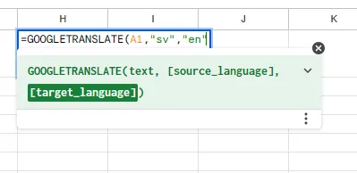 Note that: Source Language — Swedish and the Target Language — English. These are represented as “sv” and “en” respectively while translating using Google Sheets.